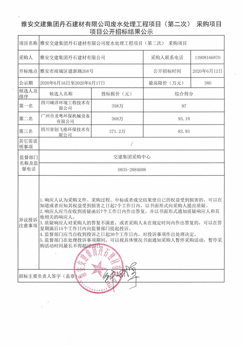 雅安交建集團(tuán)丹石建材有限公司廢水處理工程項(xiàng)目(第二次)采購(gòu)項(xiàng)目公開(kāi)招標(biāo)結(jié)果公示