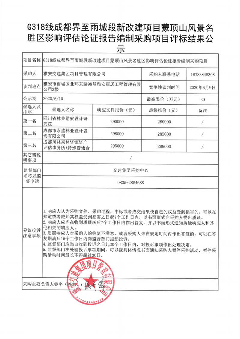 雅安交建集團(tuán)項(xiàng)目管理有限公司G318線成都界至雨城段新改建項(xiàng)目蒙頂山風(fēng)景名勝區(qū)影響評估論證報告編制采購項(xiàng)目評標(biāo)結(jié)果公示