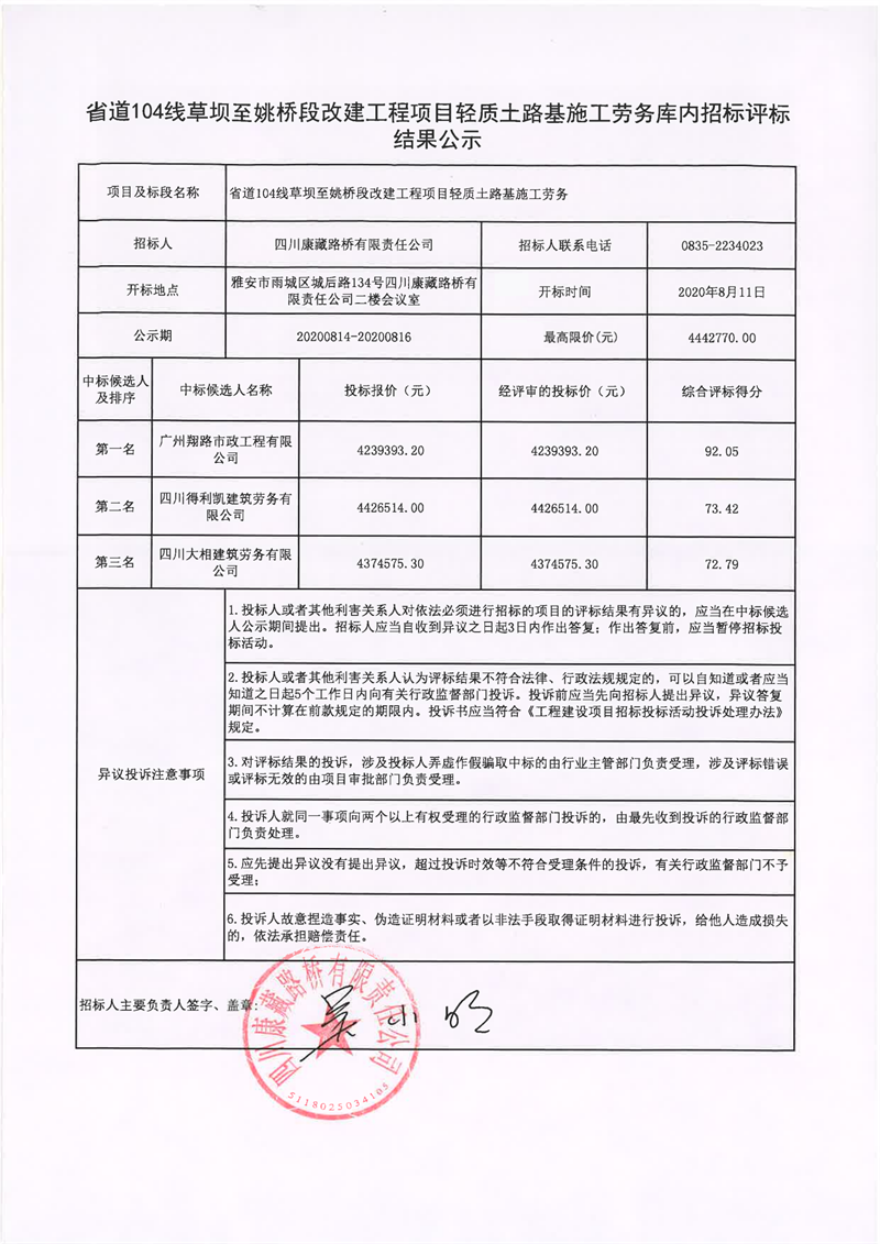 四川康藏路橋有限責任公司省道104線草壩至姚橋段改建工程項目輕質(zhì)土路基施工勞務庫內(nèi)招標評標結果公示