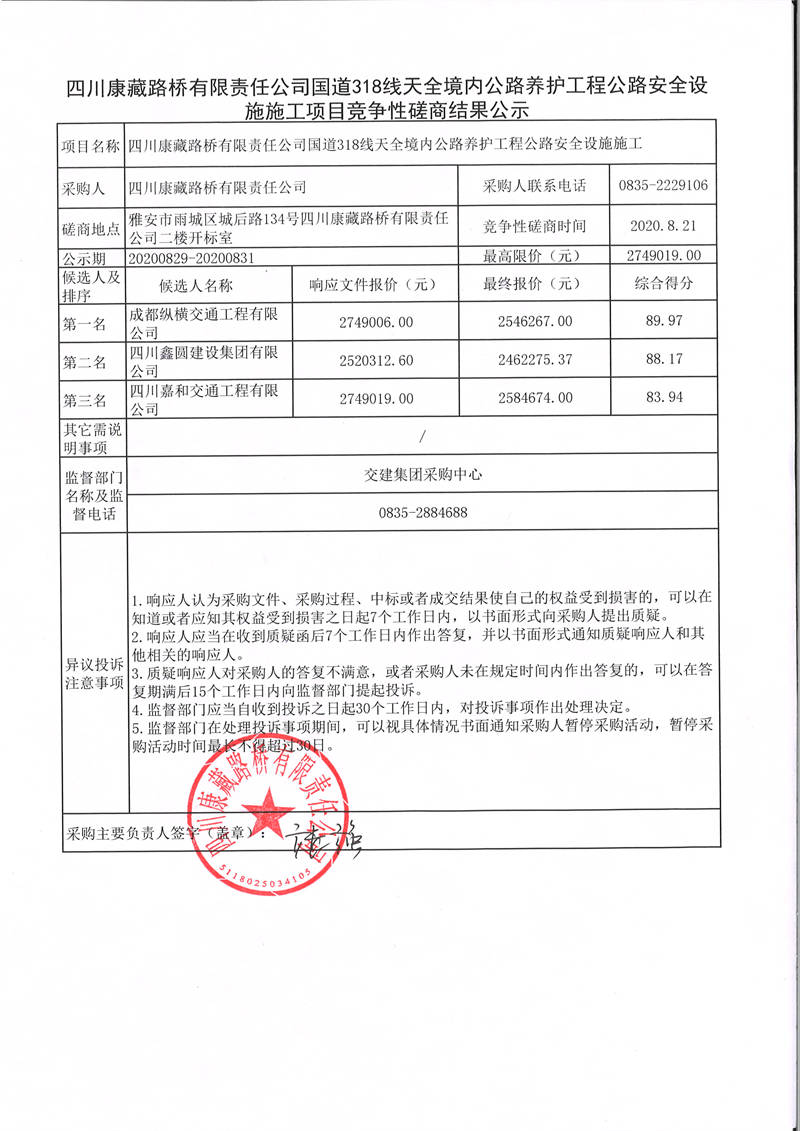 四川康藏路橋有限責(zé)任公司國道318線天全境內(nèi)公路養(yǎng)護(hù)工程公路安全設(shè)施施工項目競爭性磋商結(jié)果公示