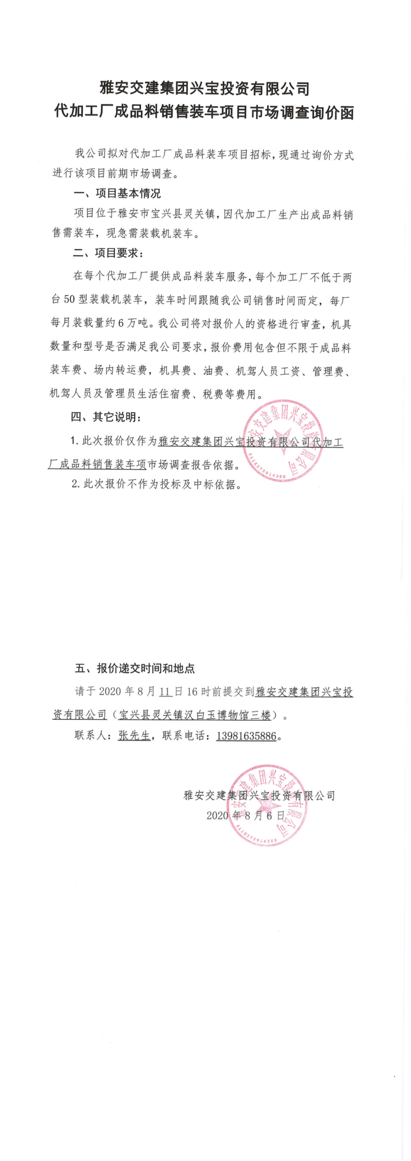 雅安交建集團(tuán)興寶投資有限公司代加工成品料銷售裝車項(xiàng)目市場(chǎng)調(diào)查詢價(jià)函