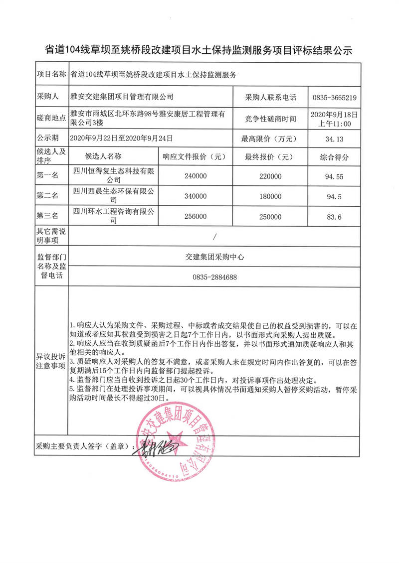 雅安交建集團項目管理有限公司省道104線草壩至姚橋段改建項目水土保持監(jiān)測服務項目評標結果公示