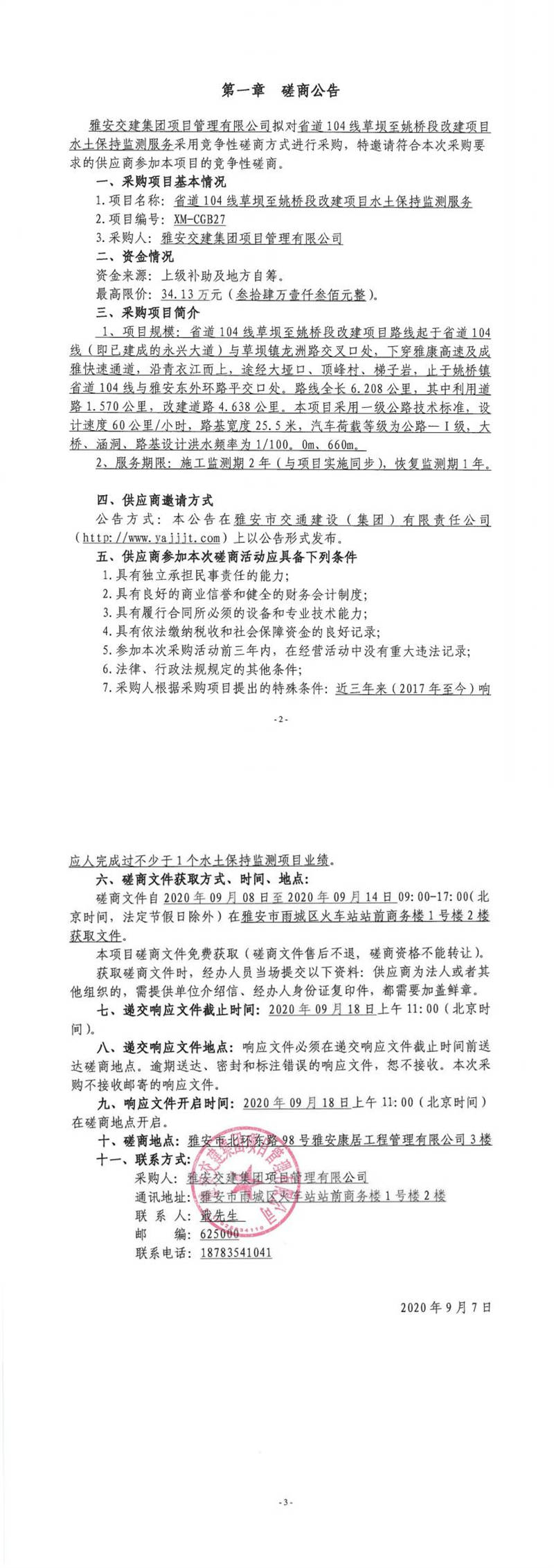 雅安交建集團項目管理有限公司省道104線草壩至姚橋段改建項目水土保持監(jiān)測服務競爭性磋商公告