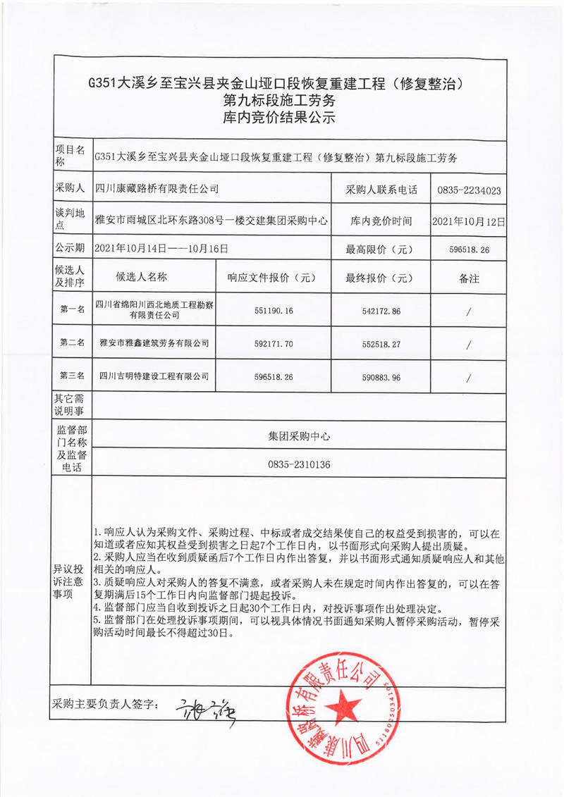 四川康藏路橋有限責任公司G351大溪鄉(xiāng)至寶興縣夾金山埡口段恢復重建工程(修復整治)第九標段施工勞務庫內競價結果公示