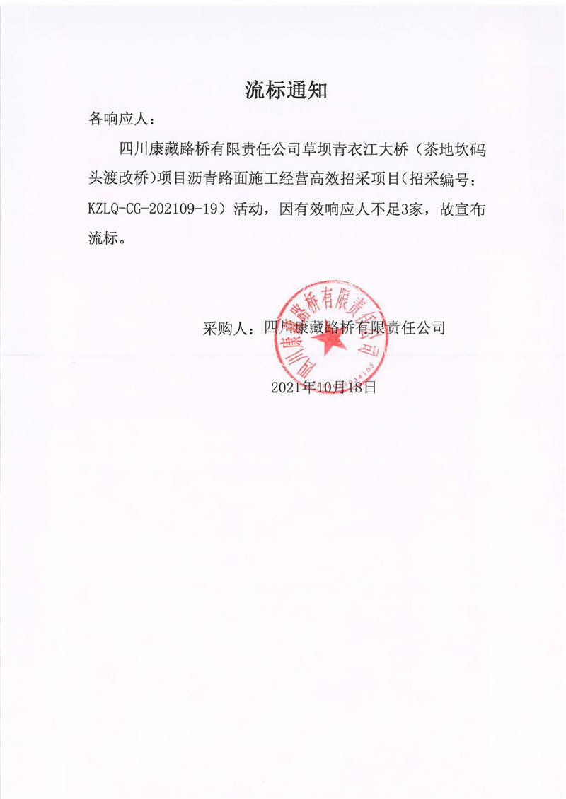四川康藏路橋有限責任公司草壩青衣江大橋(茶地坎碼頭渡改橋)項目瀝青路面施工經(jīng)營高效招采項目流標通知