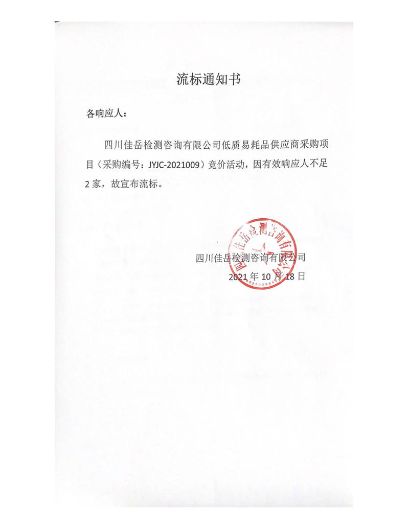 四川佳岳檢測咨詢有限公司低質(zhì)易耗品供應(yīng)商采購項目流標通知