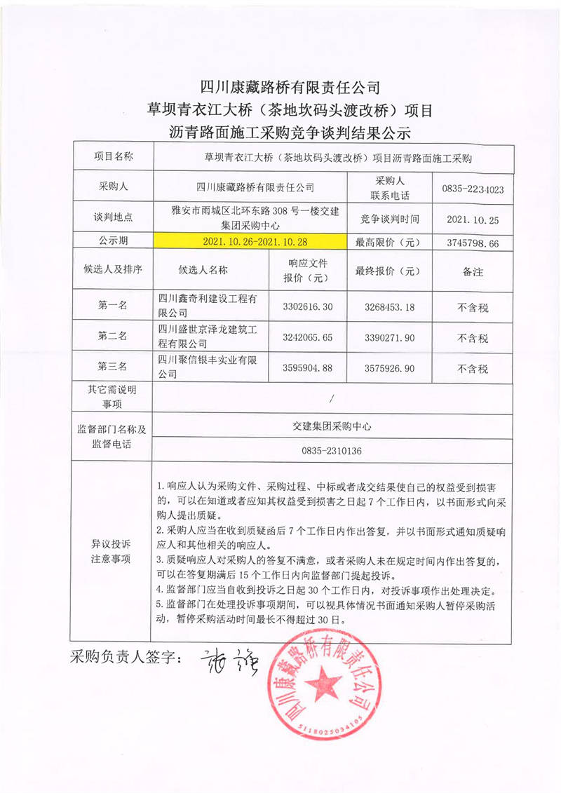 四川康藏路橋有限責(zé)任公司草壩青衣江大橋(茶地坎碼頭渡改橋)項(xiàng)目瀝青路面施工采購(gòu)競(jìng)爭(zhēng)談判結(jié)果公示