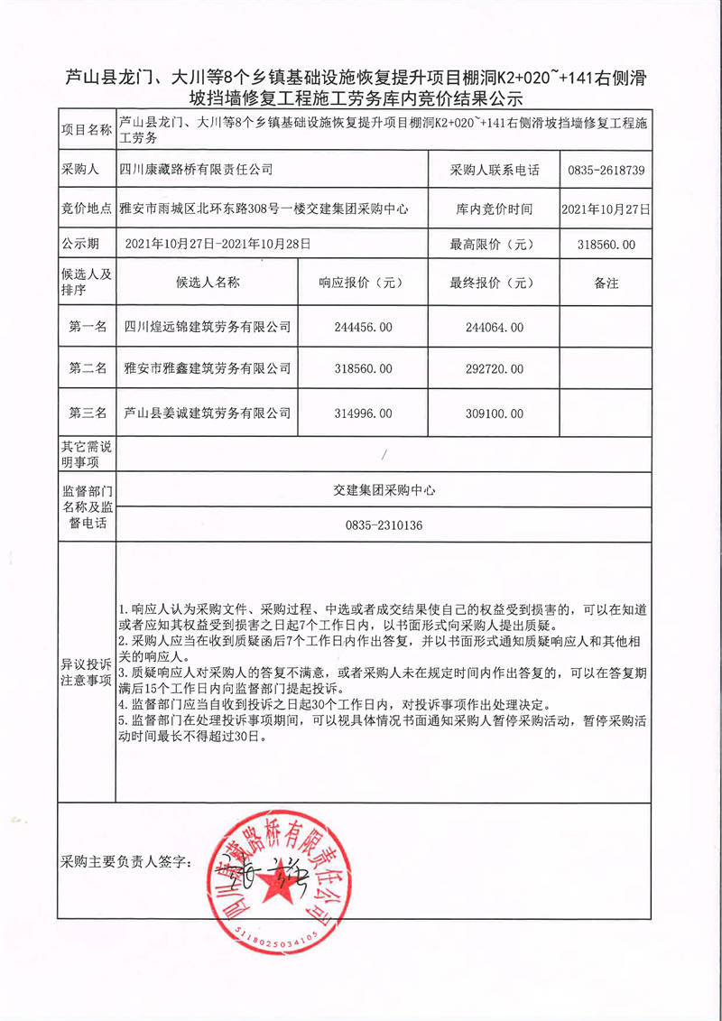 四川康藏路橋有限責(zé)任公司蘆山縣龍門(mén)、大川等8個(gè)鄉(xiāng)鎮(zhèn)基礎(chǔ)設(shè)施恢復(fù)提升項(xiàng)目棚洞K2+020~+141右側(cè)滑坡?lián)鯄π迯?fù)工程施工勞務(wù)庫(kù)內(nèi)競(jìng)價(jià)結(jié)果公示