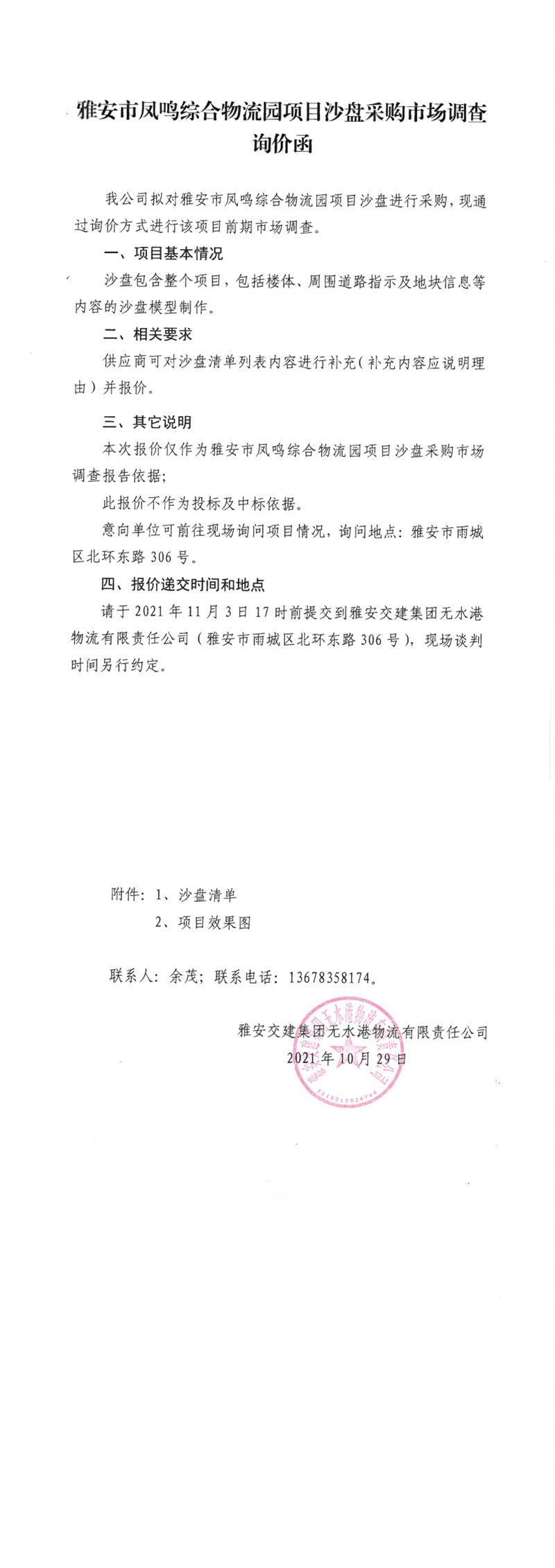 雅安交建集團(tuán)無(wú)水港物流有限責(zé)任公司雅安市鳳鳴綜合物流園項(xiàng)目沙盤(pán)采購(gòu)市場(chǎng)調(diào)查詢價(jià)函