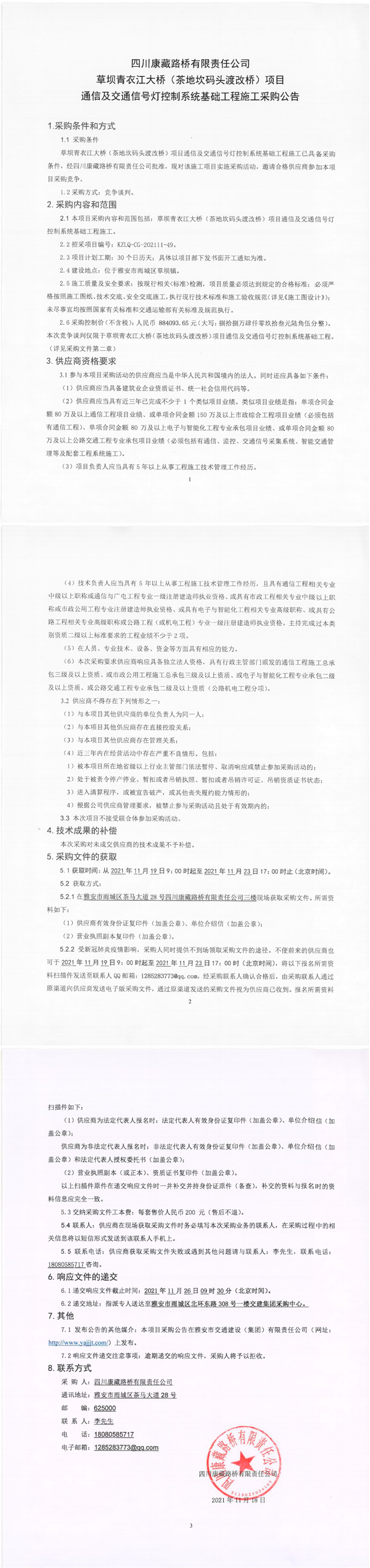 四川康藏路橋有限責任公司草壩青衣江大橋(茶地坎碼頭渡改橋)項目通信及交通信號燈控制系統(tǒng)基礎(chǔ)工程施工采購公告