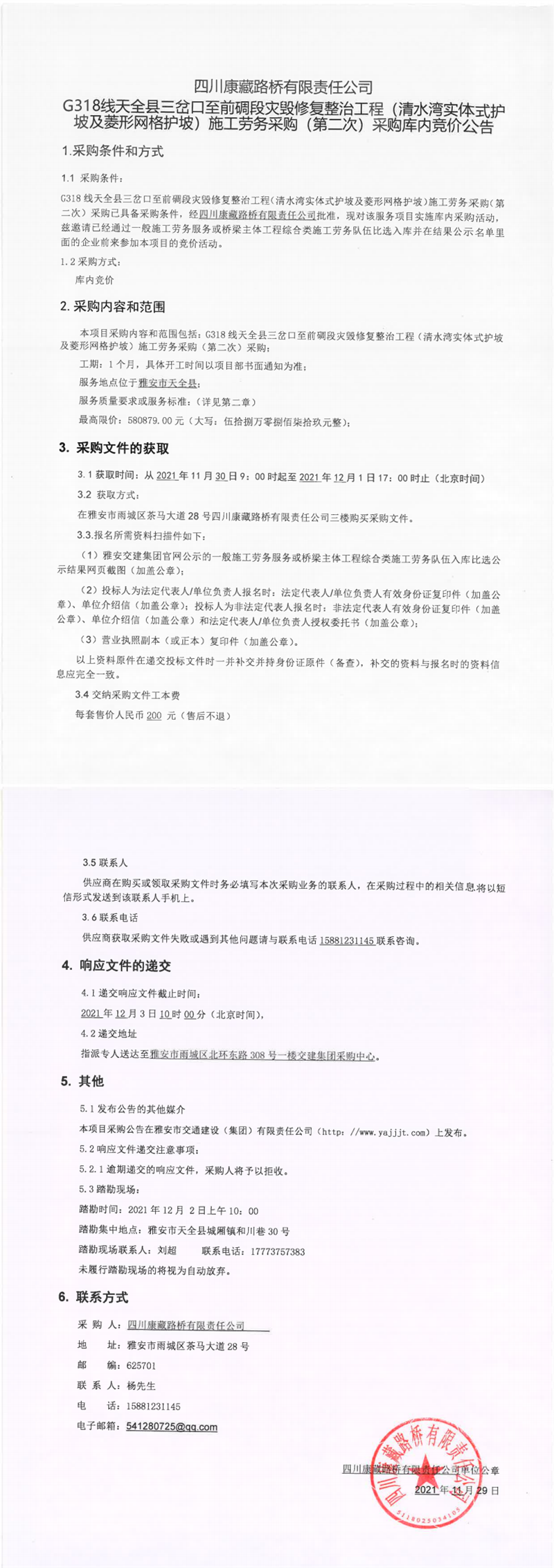 四川康藏路橋有限責(zé)任公司G318線天全縣三岔口至前碉段災(zāi)毀修復(fù)整治工程(清水灣實體式護坡及菱形網(wǎng)護坡)施工勞務(wù)采購(第二次)采購庫內(nèi)競價公告