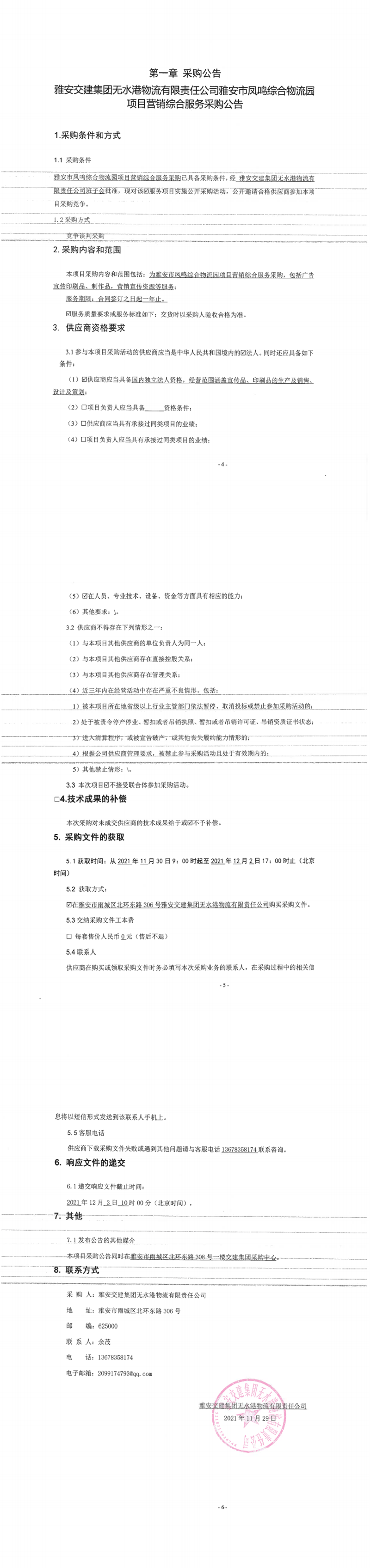 雅安交建集團無水港物流有限責(zé)任公司雅安市鳳鳴綜合物流園項目營銷綜合服務(wù)采購公告