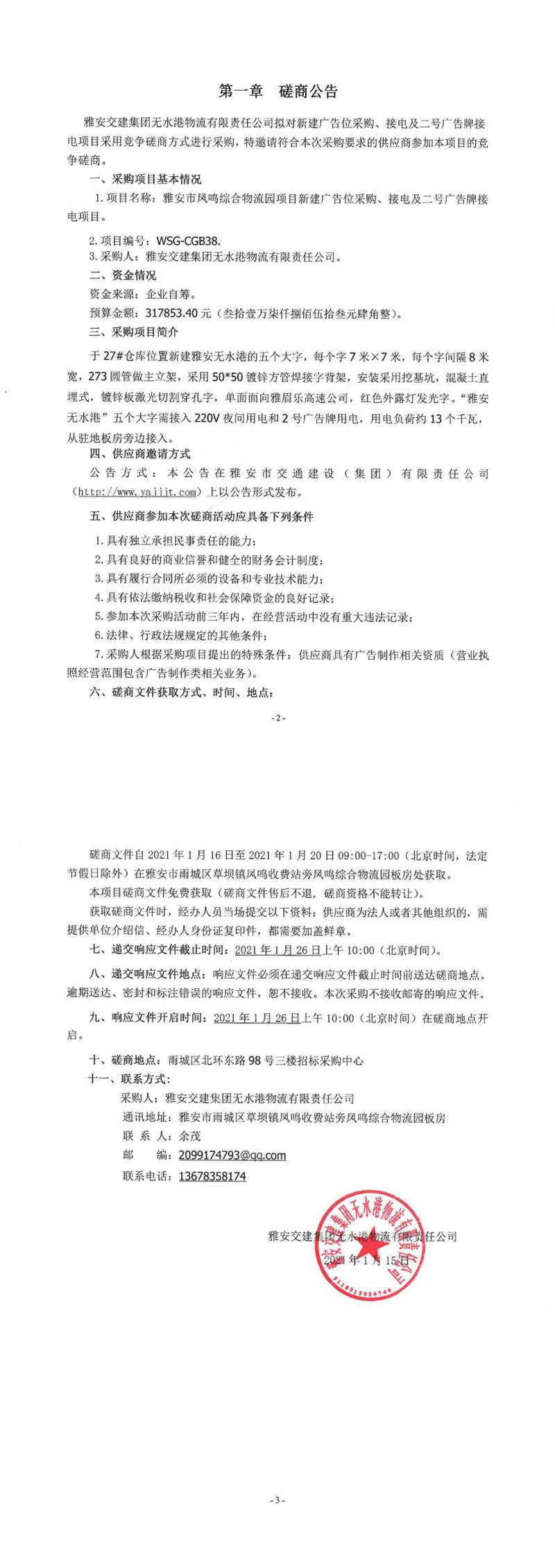 雅安交建集團(tuán)無(wú)水港物流有限責(zé)任公司雅安市鳳鳴綜合物流園項(xiàng)目新建廣告位采購(gòu)、接電及二號(hào)廣告牌接電項(xiàng)目磋商公告