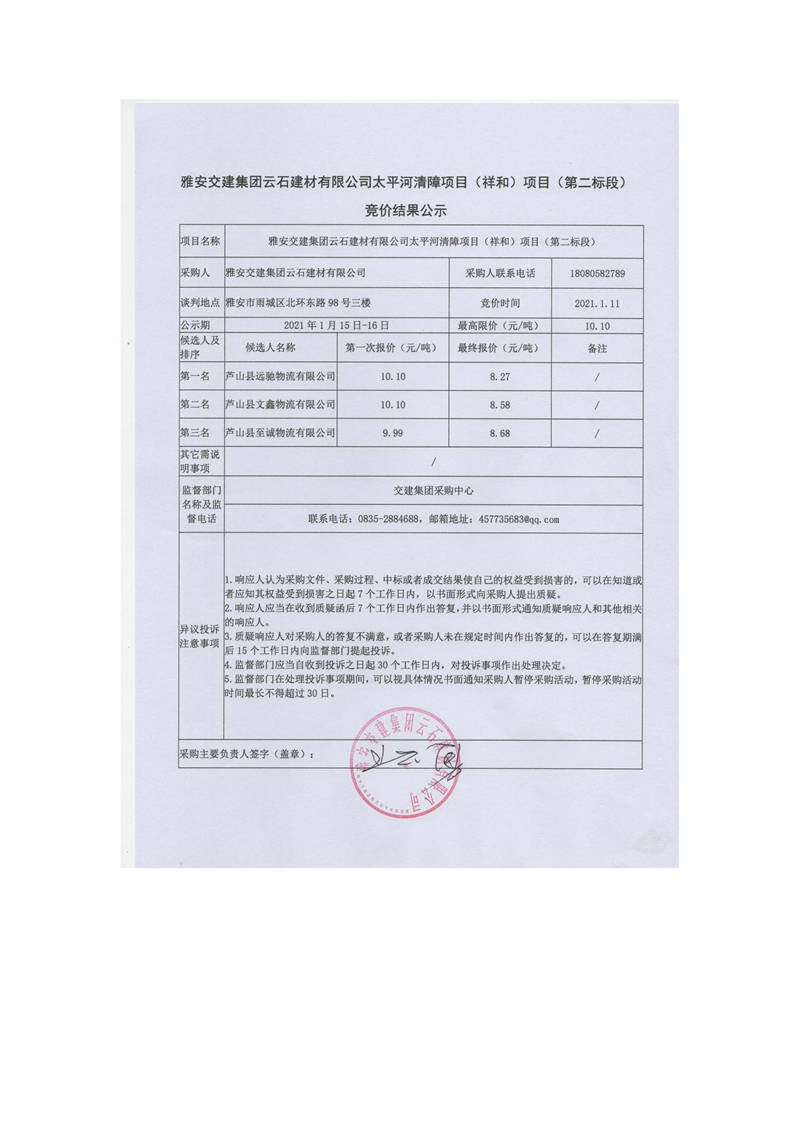 雅安交建集團(tuán)云石建材有限公司太平河清障項目(祥和)項目(第二標(biāo)段)競價結(jié)果公示