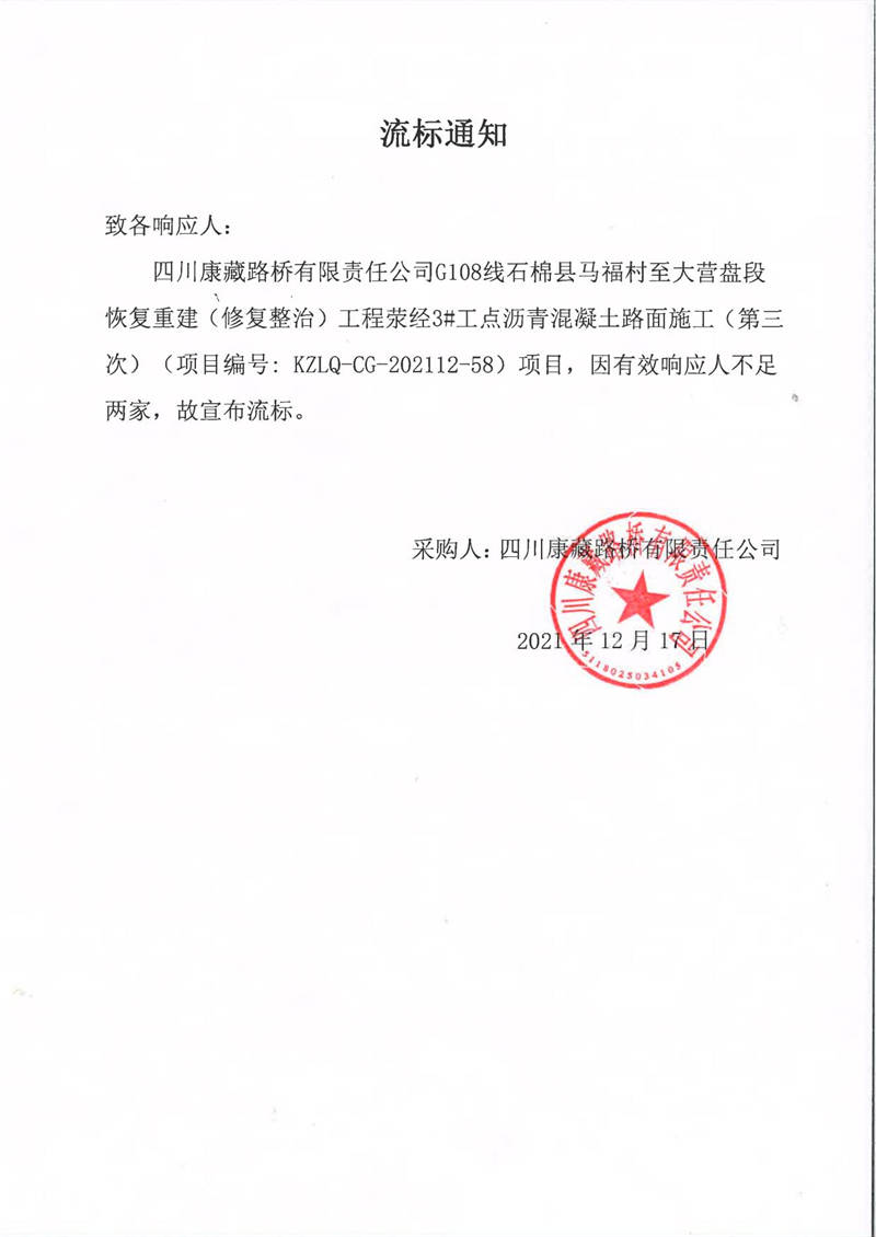 四川康藏路橋有限責(zé)任公司G108線石棉縣馬福村至大營盤段恢復(fù)重建(修復(fù)整治)工程滎經(jīng)3#工點瀝青混凝土路面施工(第三次)流標(biāo)通知