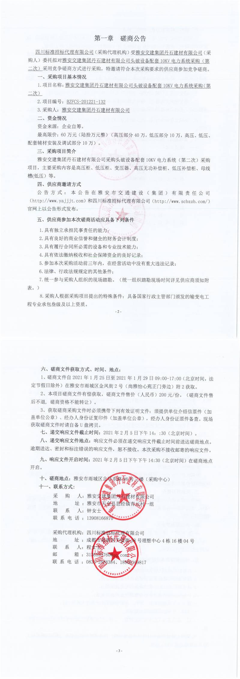 雅安交建集團(tuán)丹石建材有限公司頭破設(shè)備配套10KV電力系統(tǒng)采購(第二次)競(jìng)爭(zhēng)磋商公告