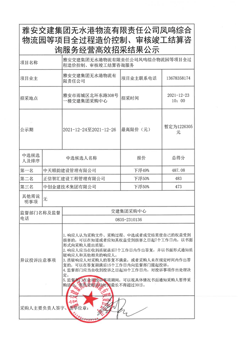 雅安交建集團無水港物流有限責任公司鳳鳴綜合物流等項目全過程造價控制、審核竣工結(jié)算咨詢服務(wù)經(jīng)營高效招采結(jié)果公示