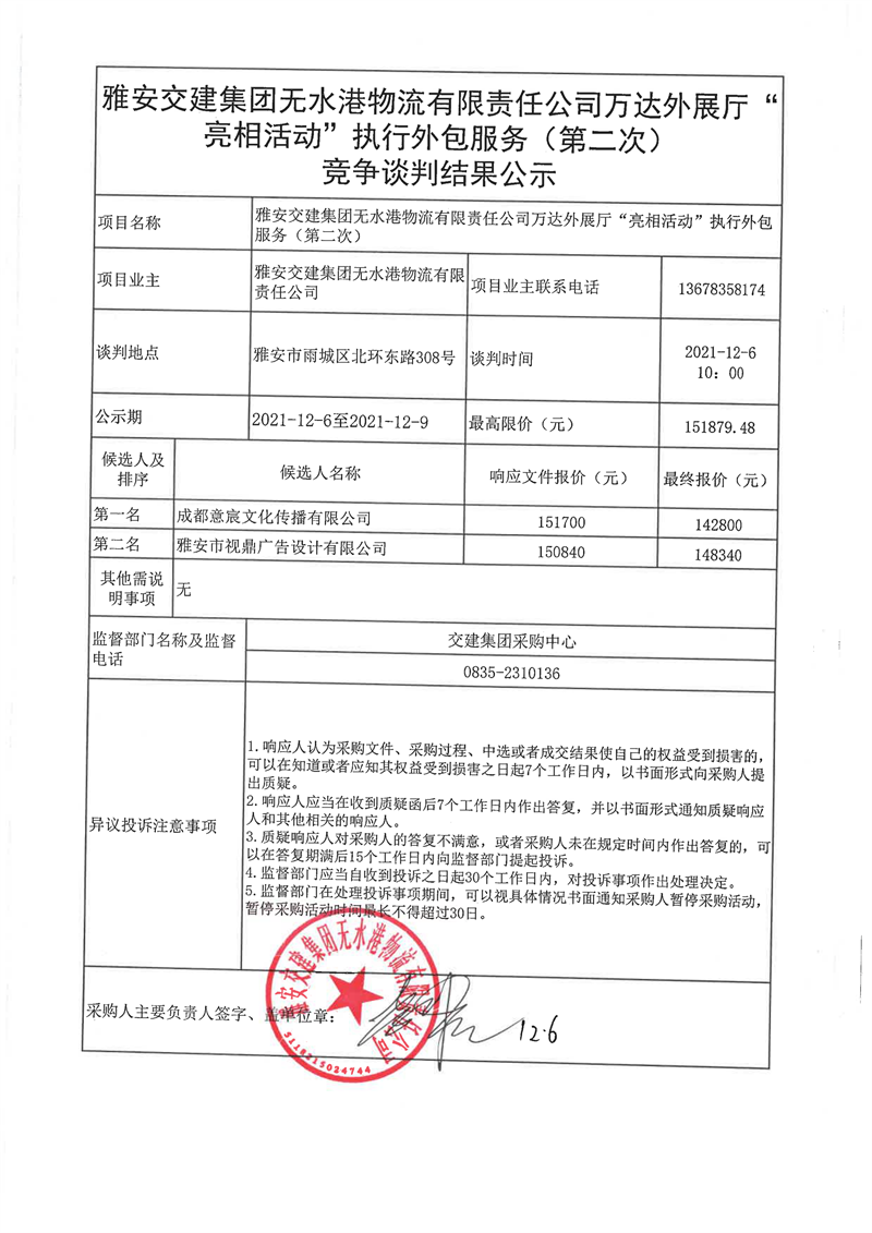 雅安交建集團無水港物流有限責(zé)任公司萬達外展廳“亮相活動”執(zhí)行外包服務(wù)(第二次)競爭談判結(jié)果公示