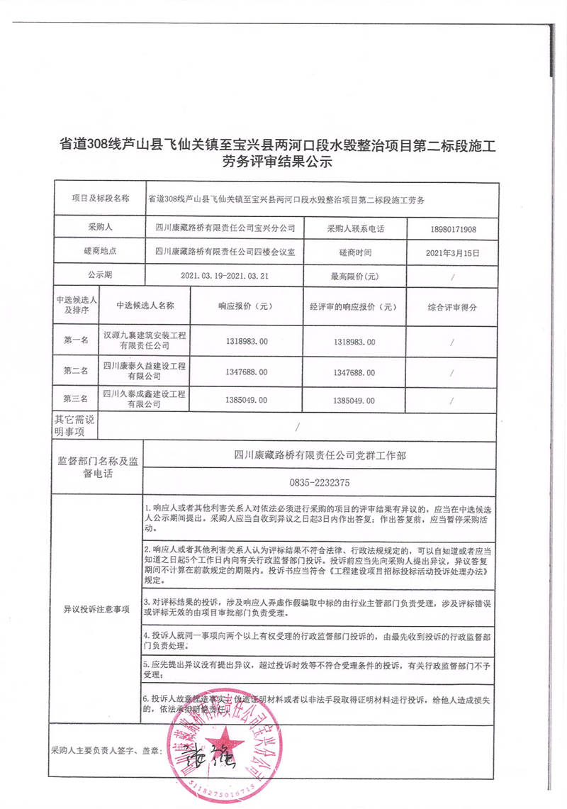 四川康藏路橋有限責任公司寶興分公司省道308線蘆山縣飛仙關鎮(zhèn)至寶興縣兩河口段水毀整治項目第二標段施工勞務評審結果公示
