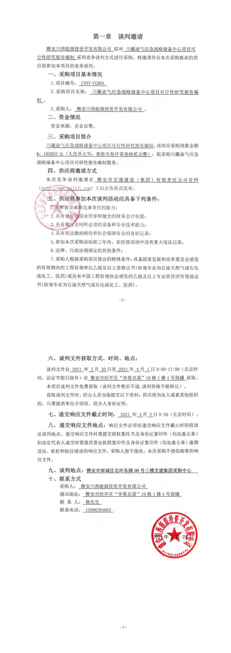 雅安川西能源投資開(kāi)發(fā)有限公司川藏油氣應(yīng)急戰(zhàn)略儲(chǔ)備中心項(xiàng)目可行性研究報(bào)告編制競(jìng)爭(zhēng)談判公告