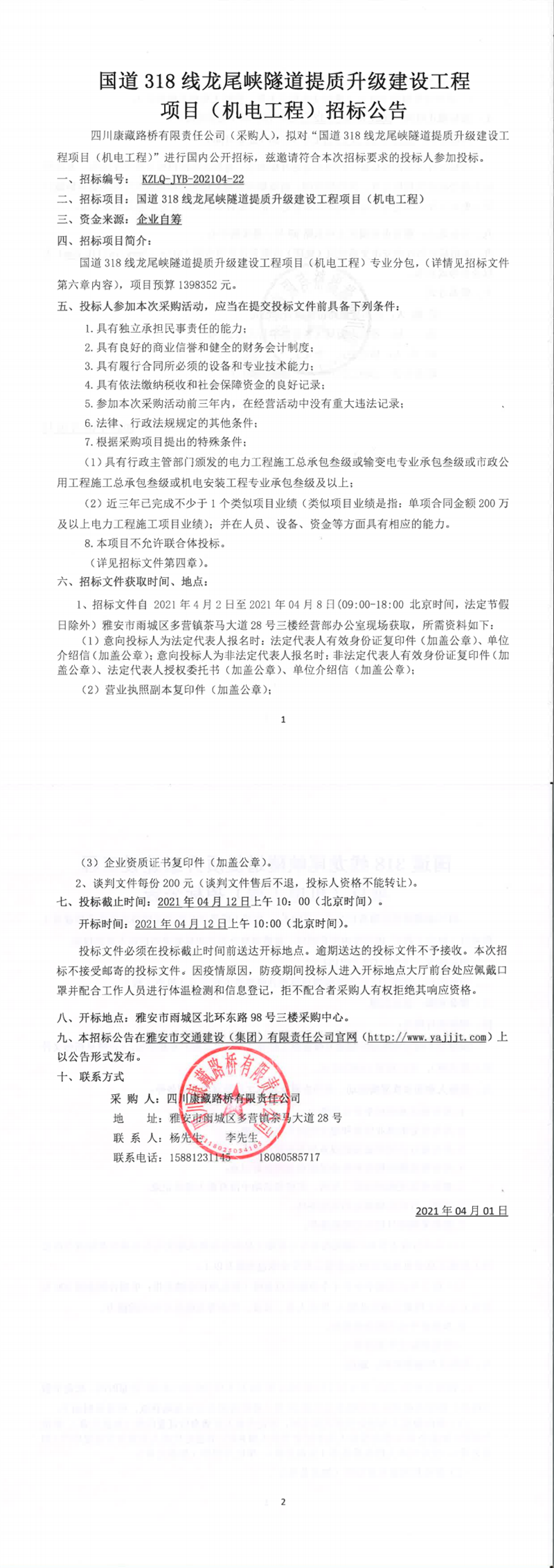 四川康藏路橋有限責任公司國道318線龍尾峽隧道提質(zhì)升級建設(shè)工程項目(機電工程)招標公告