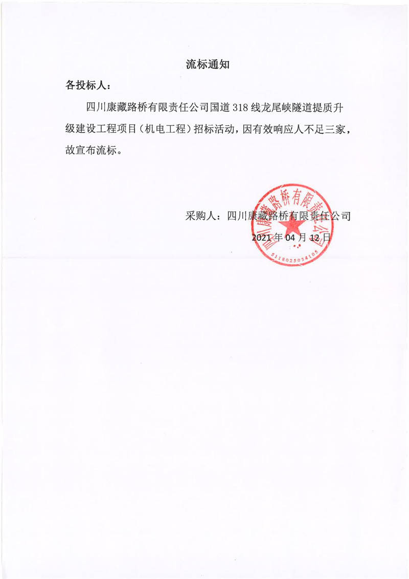 四川康藏路橋有限責任公司國道318線龍尾峽隧道提質(zhì)升級建設(shè)工程項目(機電工程)流標通知
