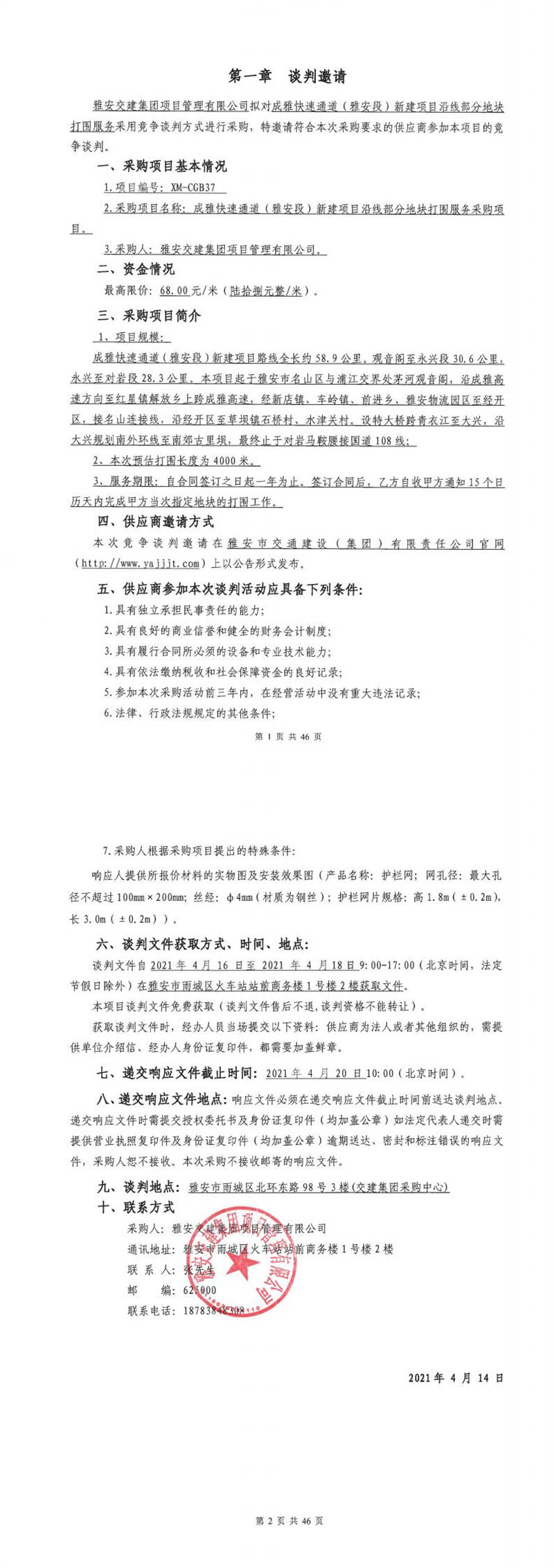 雅安交建集團(tuán)項(xiàng)目管理有限公司成雅快速通道(雅安段)新建項(xiàng)目沿線部分地塊打圍服務(wù)采購(gòu)項(xiàng)目競(jìng)爭(zhēng)談判公告