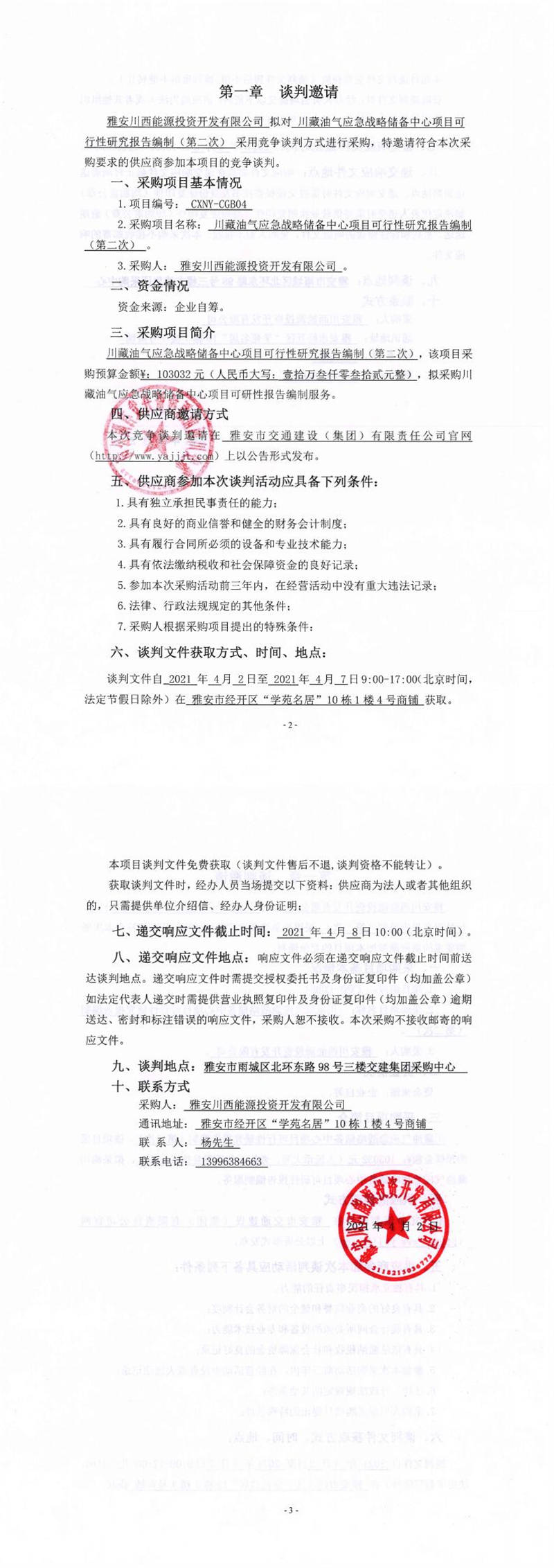 雅安川西能源投資開發(fā)有限公司川藏油氣應(yīng)急戰(zhàn)略儲備中心項目可行性研究報告編制(第二次)競爭談判公告