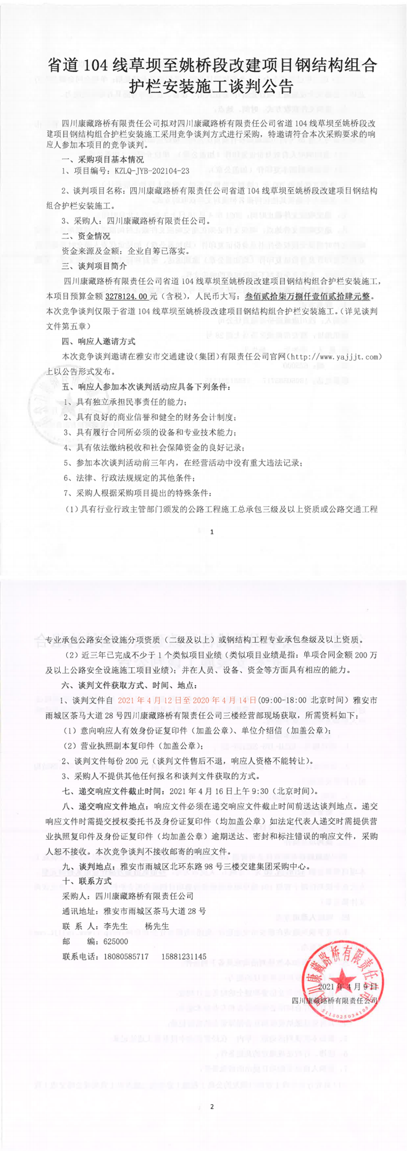 四川康藏路橋有限責任公司省道104線草壩至姚橋段改建項目鋼結構組合護欄安裝施工談判公告