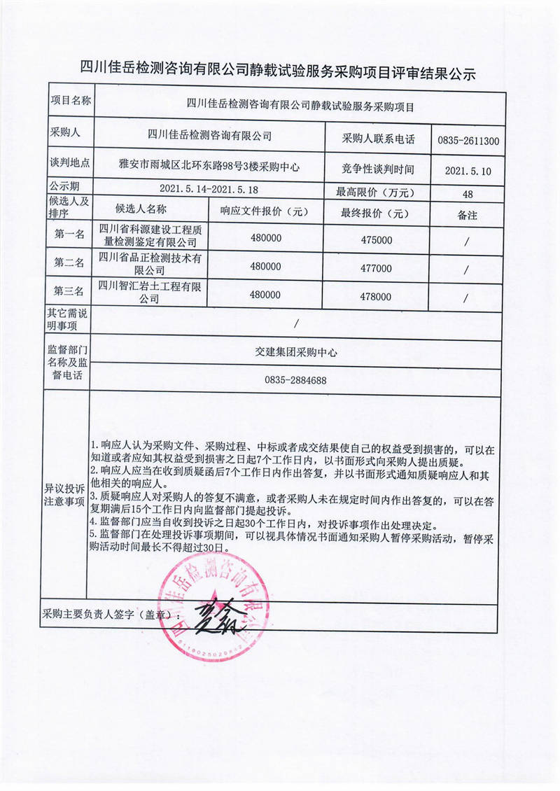四川佳岳檢測咨詢有限公司靜載試驗服務采購項目評審結果公示
