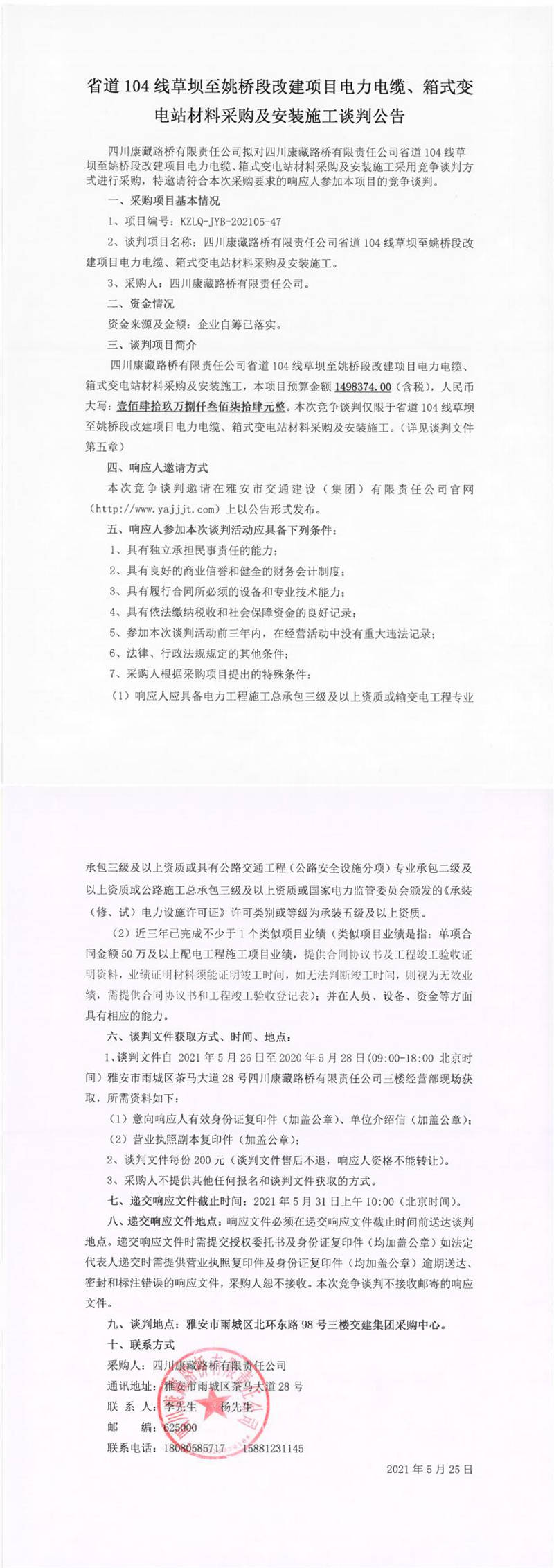 四川康藏路橋有限責(zé)任公司省道104線草壩至姚橋段改建項(xiàng)目電力電纜、箱式變電站材料采購(gòu)及安裝施工談判公告