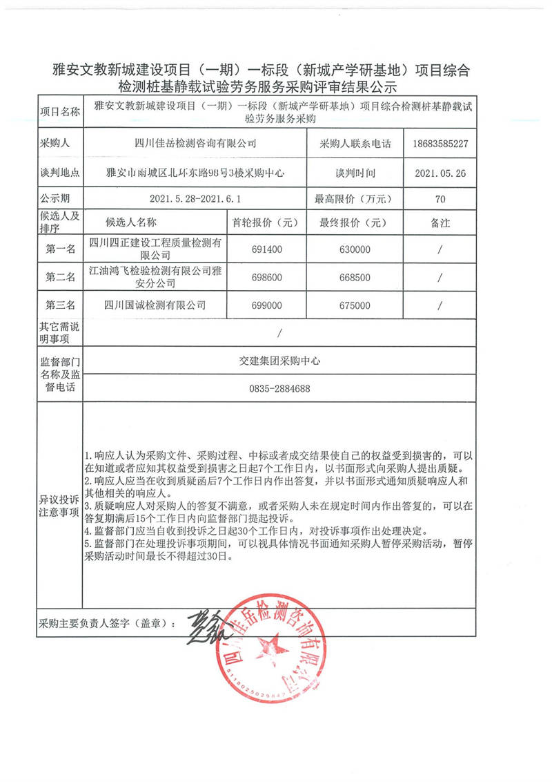 四川佳岳檢測(cè)咨詢有限公司雅安文教新城建設(shè)項(xiàng)目(一期)一標(biāo)段(新城產(chǎn)學(xué)研基地)項(xiàng)目綜合檢測(cè)樁基靜載試驗(yàn)勞務(wù)服務(wù)采購(gòu)評(píng)審結(jié)果公示