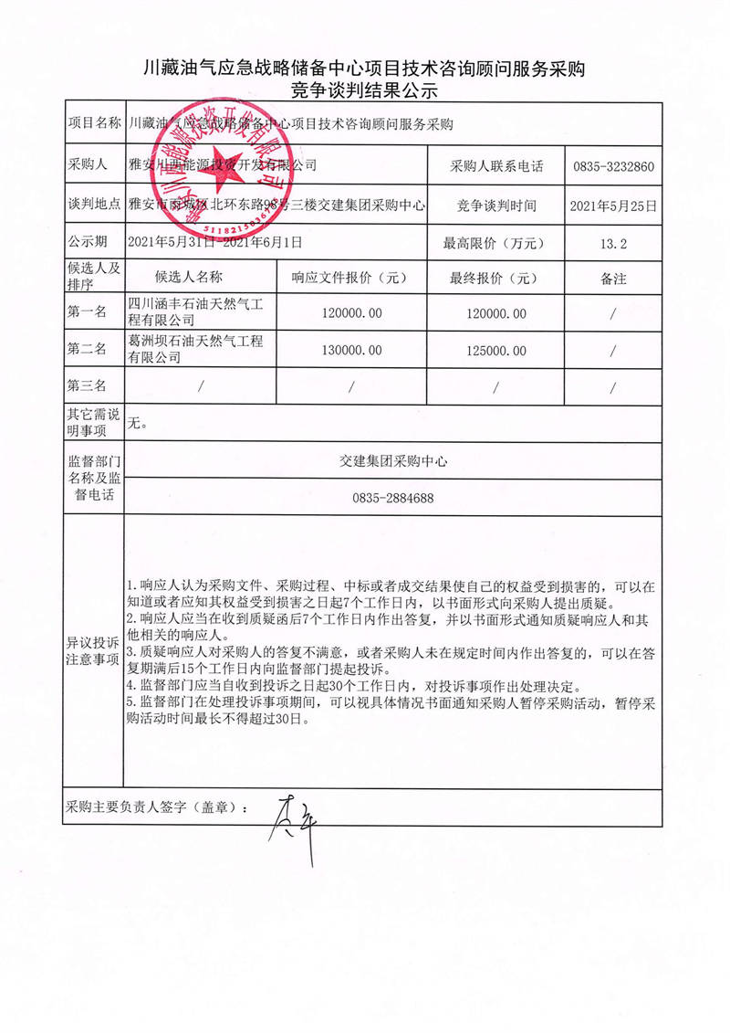 雅安川西能源投資開發(fā)有限公司川藏油氣應(yīng)急戰(zhàn)略儲(chǔ)備中心項(xiàng)目技術(shù)咨詢顧問服務(wù)采購競(jìng)爭談判結(jié)果公示
