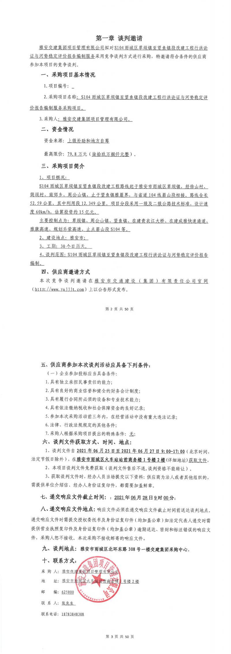 雅安交建集團(tuán)項(xiàng)目管理有限公司S104雨城區(qū)草壩鎮(zhèn)至望魚鎮(zhèn)段改建工程行洪論證與河勢穩(wěn)定評價(jià)報(bào)告編制服務(wù)采購項(xiàng)目競爭談判公告