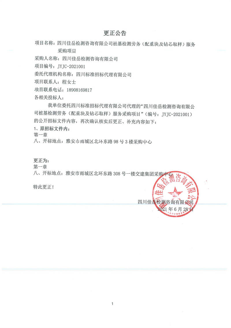 四川佳岳檢測咨詢有限公司樁基檢測勞務(wù)(配重塊及鉆芯取樣)服務(wù)采購項(xiàng)目更正公告
