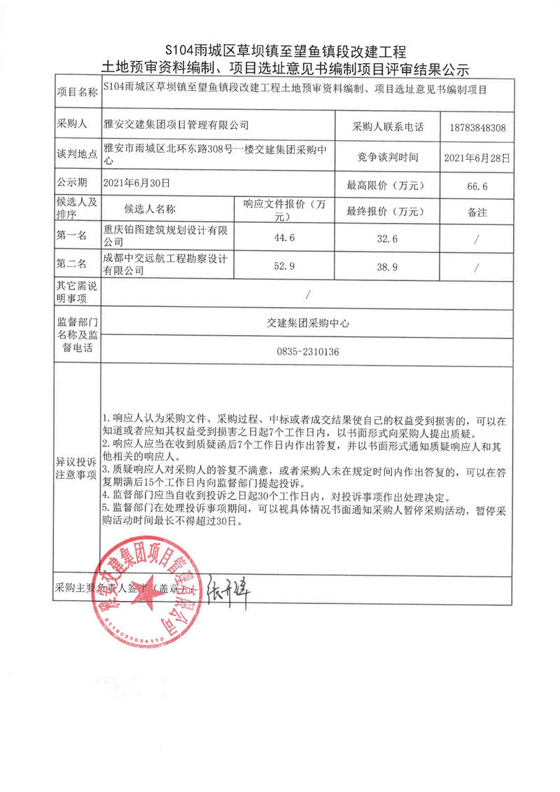 雅安交建集團項目管理有限公司S104雨城區(qū)草壩鎮(zhèn)至望魚鎮(zhèn)段改建工程土地預(yù)審資料編制、項目選址意見書編制項目評審結(jié)果公示