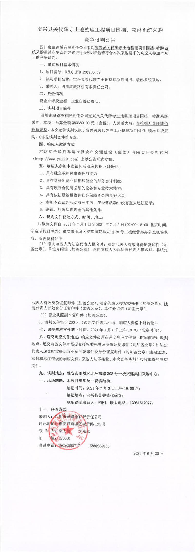 四川康藏路橋有限責(zé)任公司寶興靈關(guān)代碑寺土地整理工程項(xiàng)目圍擋、噴淋系統(tǒng)采購競爭談判公告