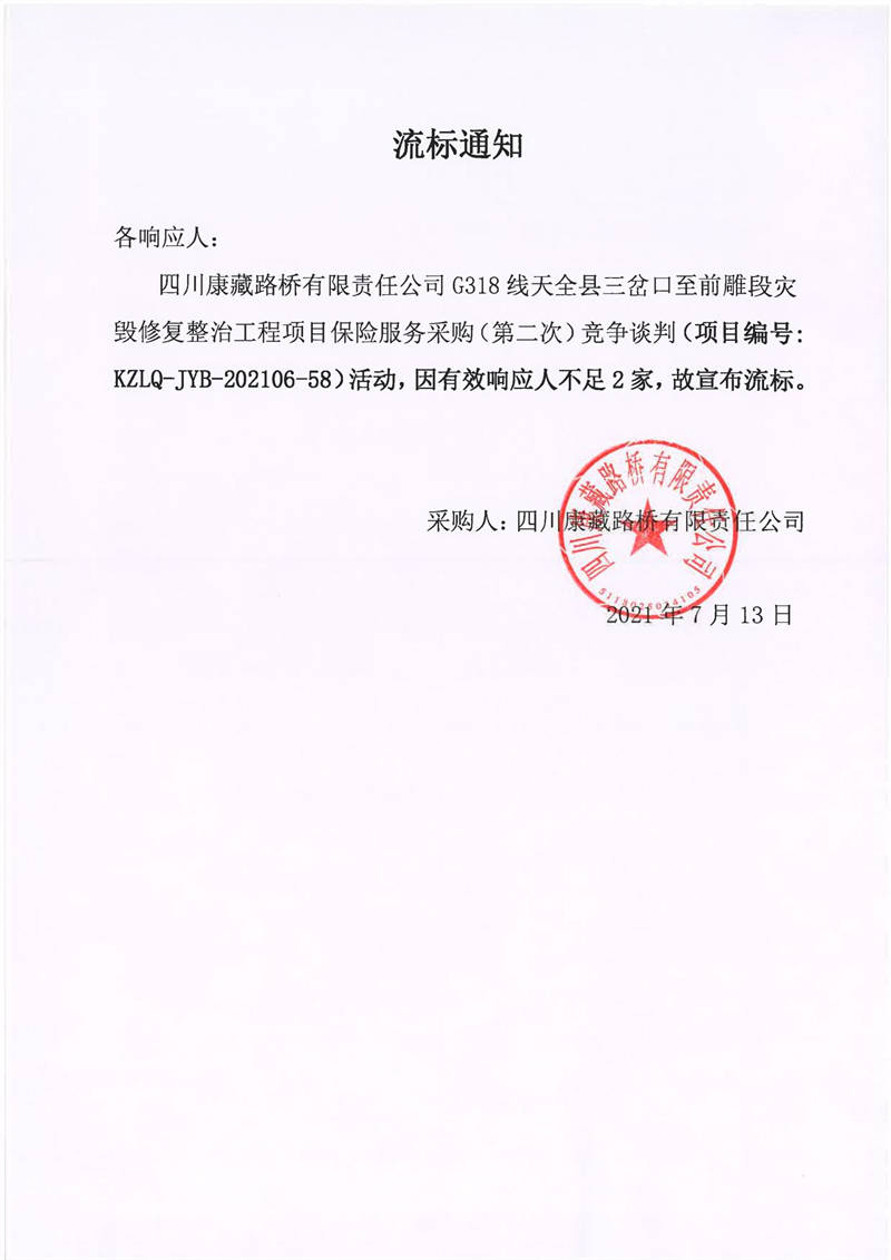 四川康藏路橋有限責任公司G318線天全縣三岔口至前雕段災毀修復整治工程項目保險服務采購(第二次)流標通知