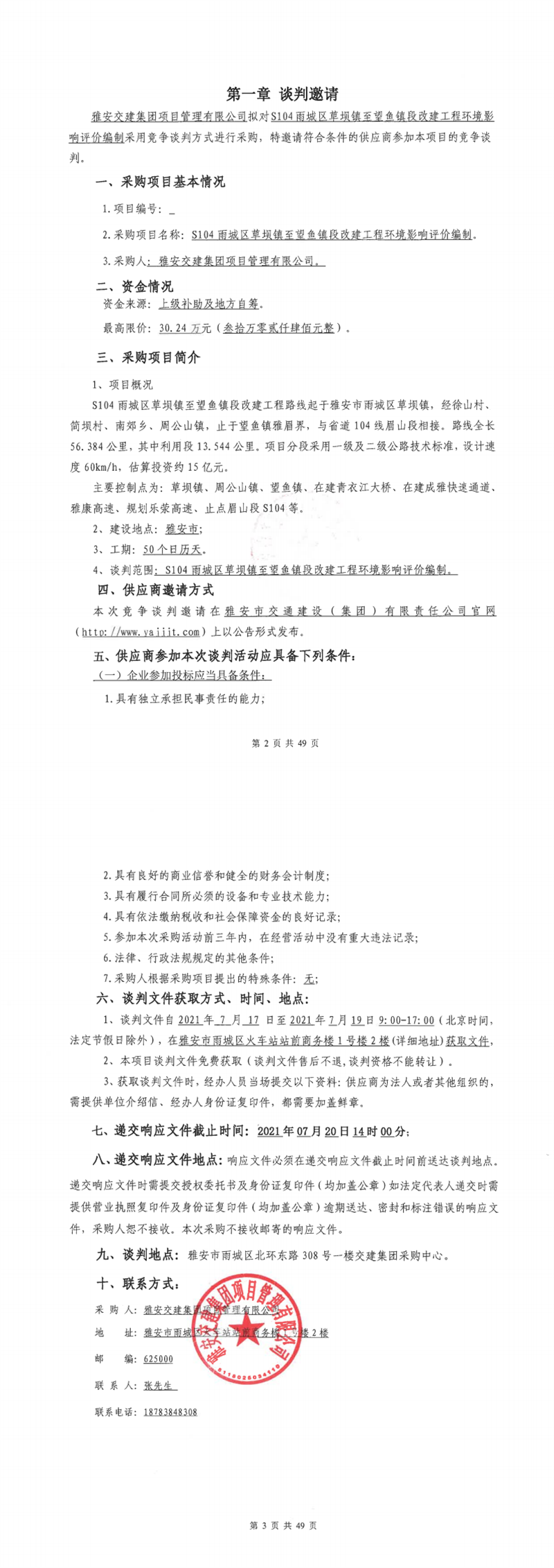 雅安交建集團(tuán)項(xiàng)目管理有限公司S104雨城區(qū)草壩鎮(zhèn)至望魚段改建工程環(huán)境影響評價(jià)編制競爭談判公告