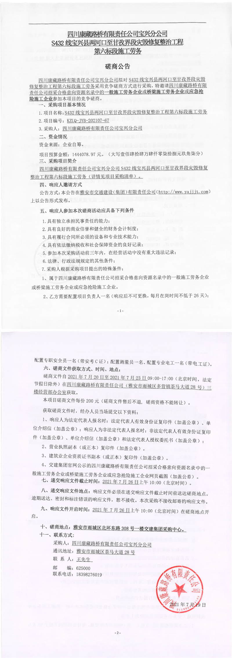 四川康藏路橋有限責(zé)任公司寶興分公司S432線(xiàn)寶興縣兩河口至甘孜界段災(zāi)毀修復(fù)整治工程第六標(biāo)段施工勞務(wù)磋商公告