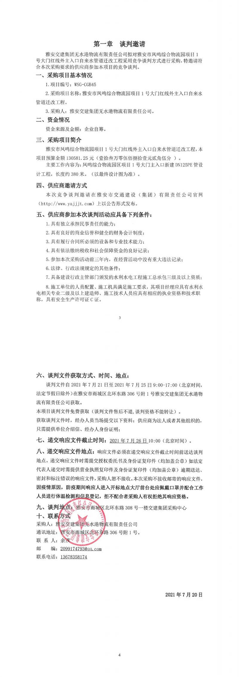 雅安交建集團(tuán)無水港物流有限責(zé)任公司雅安市鳳鳴綜合物流園項(xiàng)目1號(hào)大門紅線外主入口自來水管道遷改工程競(jìng)爭(zhēng)談判公告