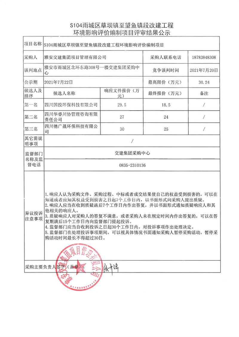 雅安交建集團項目管理有限公司S104雨城區(qū)草壩鎮(zhèn)至望魚鎮(zhèn)段改建工程水土保持方案編制服務項目評審結(jié)果公示