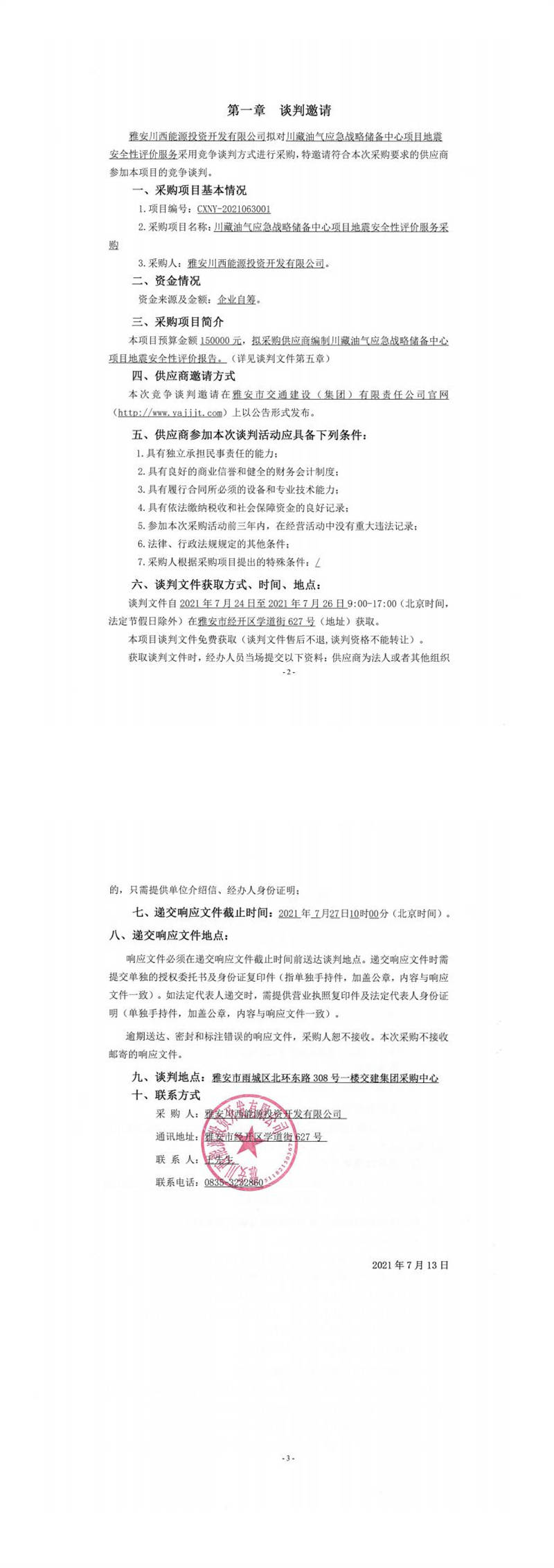 雅安川西能源投資開發(fā)有限公司川藏油氣應(yīng)急戰(zhàn)略儲備中心項(xiàng)目地震安全性評價(jià)服務(wù)采購競爭談判公告