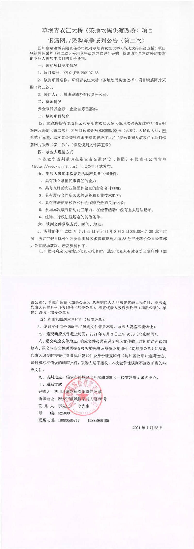 四川康藏路橋有限責(zé)任公司草壩青衣江大橋(茶地坎碼頭渡改橋)項(xiàng)目鋼筋網(wǎng)片采購(gòu)競(jìng)爭(zhēng)談判公告(第二次)