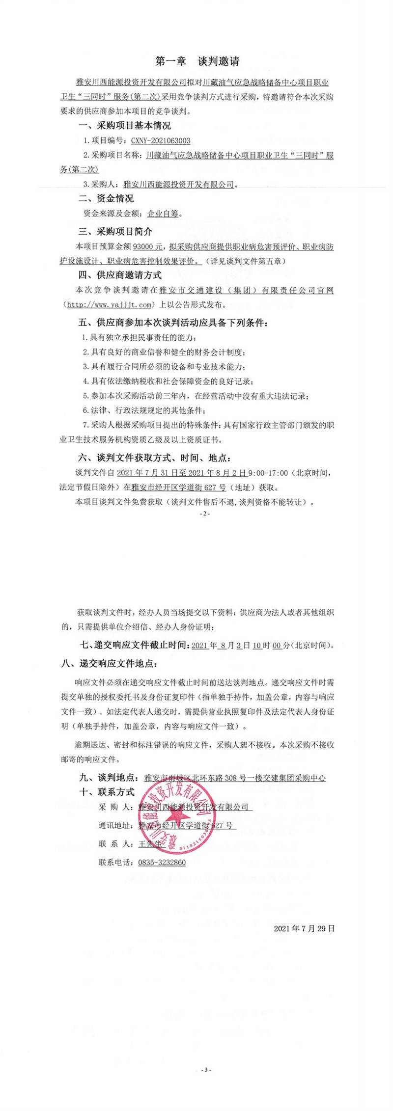 雅安川西能源投資開發(fā)有限公司川藏油氣應(yīng)急戰(zhàn)略儲(chǔ)備中心項(xiàng)目職業(yè)衛(wèi)生“三同時(shí)”服務(wù)(第二次)競(jìng)爭談判公告