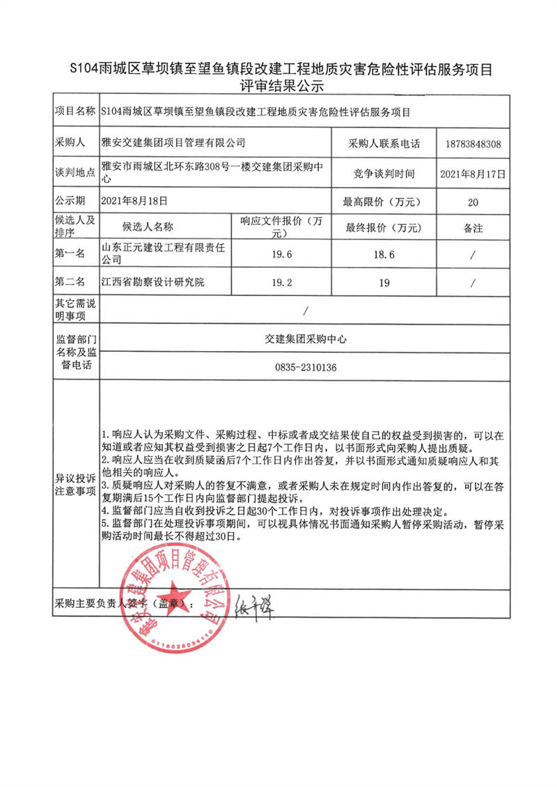 雅安交建集團項目管理有限公司S104雨城區(qū)草壩鎮(zhèn)至望魚鎮(zhèn)改建工程地質災害危險性評估服務項目評審結果公示