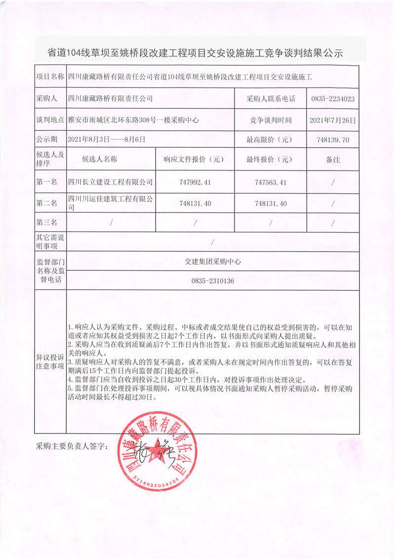 四川康藏路橋有限責任公司省道104線草壩至姚橋段改建工程項目交安設施施工競爭談判結(jié)果公示