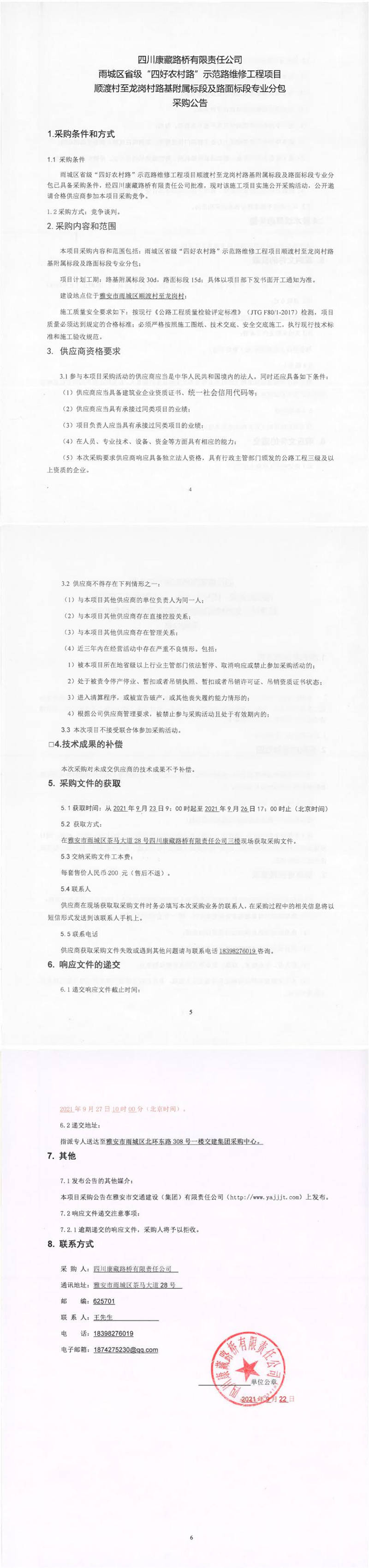 四川康藏路橋有限責(zé)任公司雨城區(qū)省級(jí)“四好農(nóng)村路”示范路維修工程項(xiàng)目順渡村至龍崗村路基附屬標(biāo)段及路面標(biāo)段專業(yè)分包采購(gòu)公告