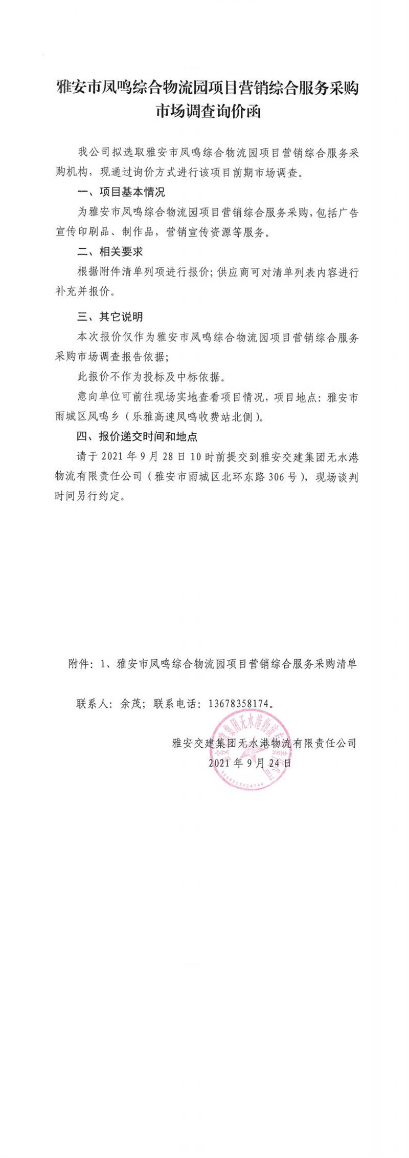 雅安交建集團(tuán)無水港物流有限責(zé)任公司雅安市鳳鳴綜合物流園項(xiàng)目營銷綜合服務(wù)采購市場(chǎng)調(diào)查詢價(jià)函
