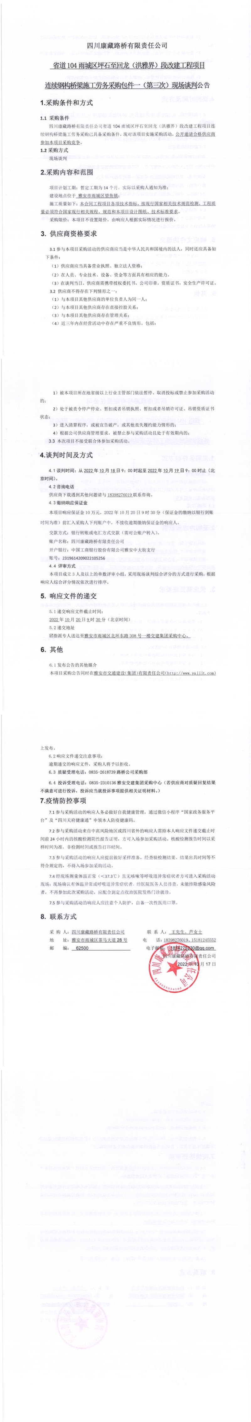 四川康藏路橋有限責(zé)任公司省道104雨城區(qū)坪石至回龍(洪雅界)段改建工程項(xiàng)目連續(xù)鋼構(gòu)橋梁施工勞務(wù)采購包件一(第三次)現(xiàn)場談判公告